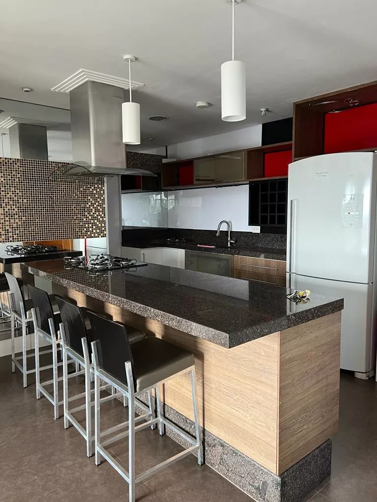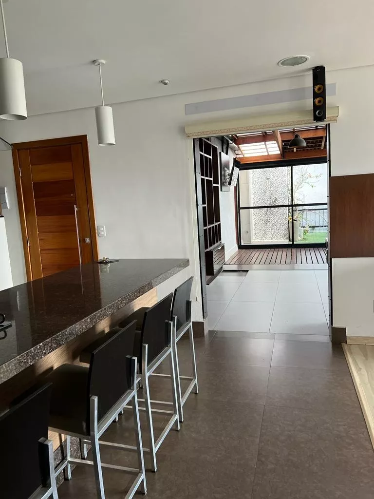 Cozinha americana totalmente equipada e churrasqueira gourmet junto ao terraço com jardim de inverno.
